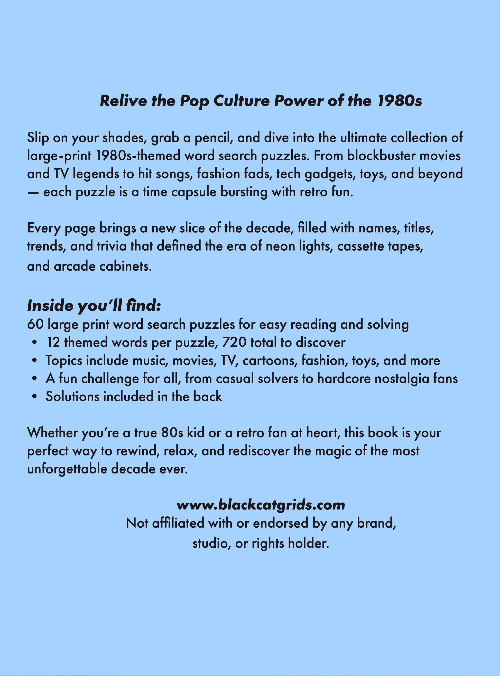 Packed with 60 themed puzzles, this book celebrates everything that made the 80s unforgettable — music, movies, TV shows, fashion, slang, and arcade games. Designed in an easy-to-read large print format, these puzzles are perfect for stress-free solving while you relax, travel, or simply enjoy a retro escape.