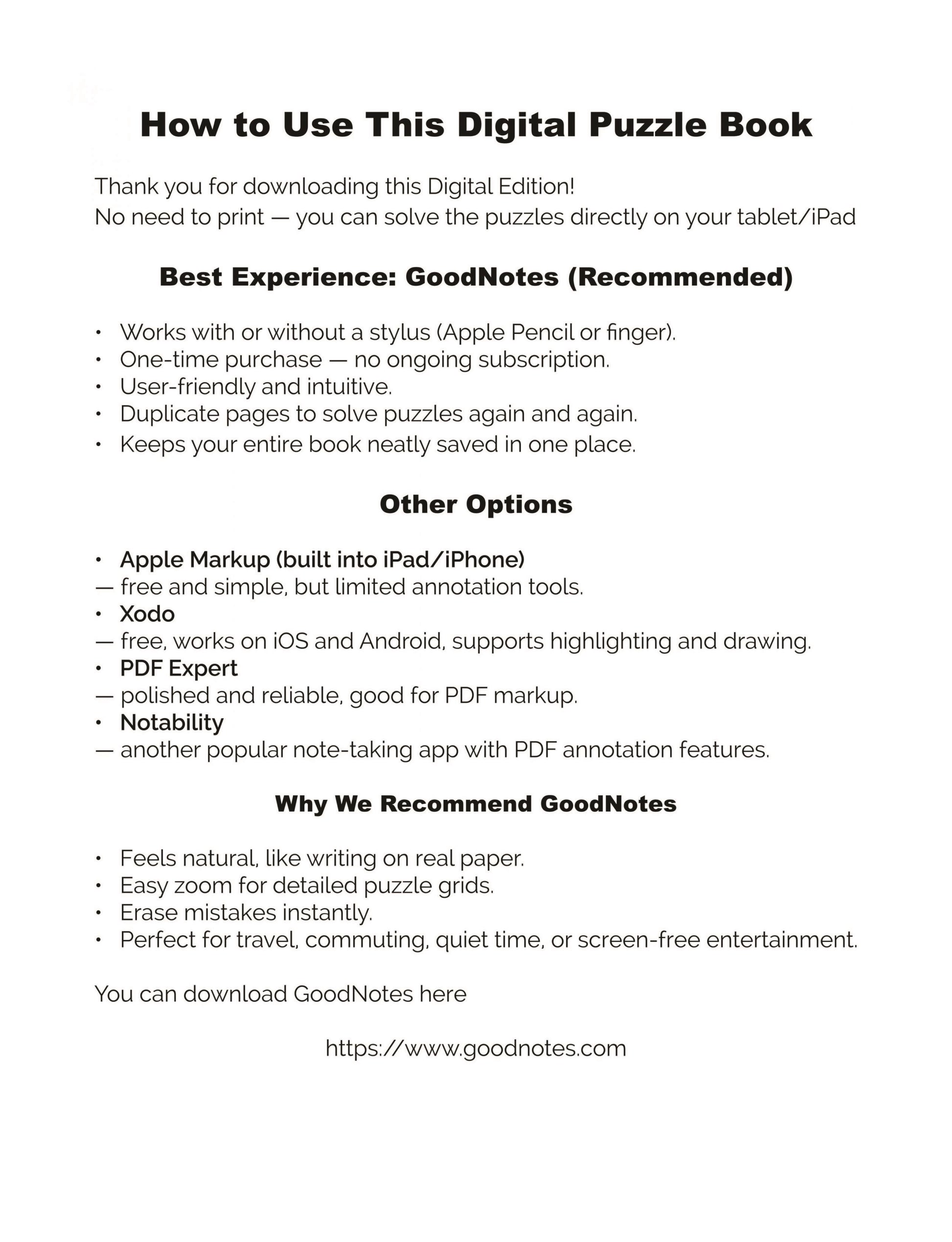 💡 Tip: Crosswords can be solved in GoodNotes with either a stylus or your finger. We recommend a stylus for the best experience, as it makes filling the puzzle grids easier and more natural.