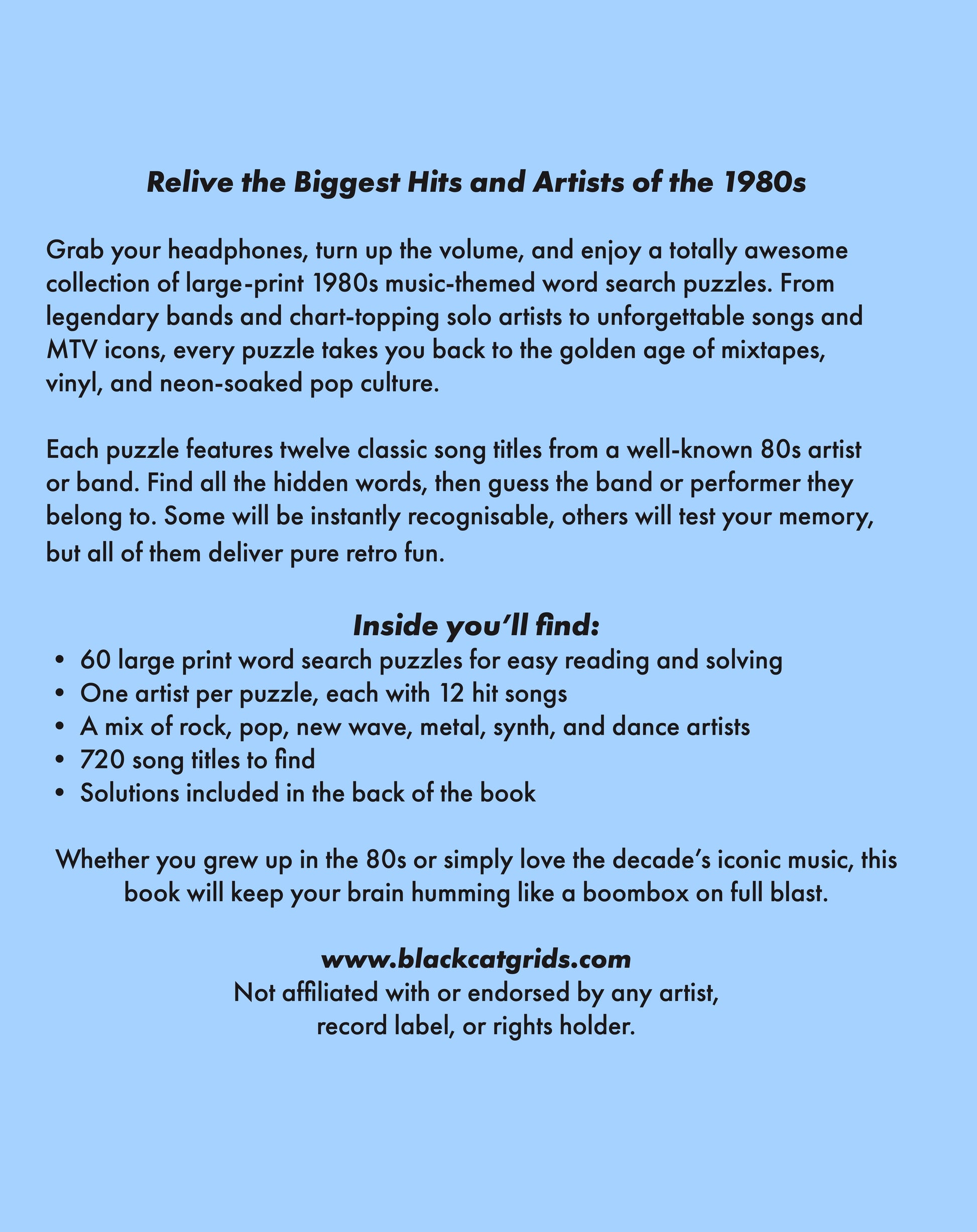 Packed with 60 themed puzzles, this collection takes you back to the era of cassette tapes, neon lights, and legendary artists. From chart-topping hits and iconic bands to timeless genres and musical trends, every puzzle is a nostalgic trip through the music that defined a generation.