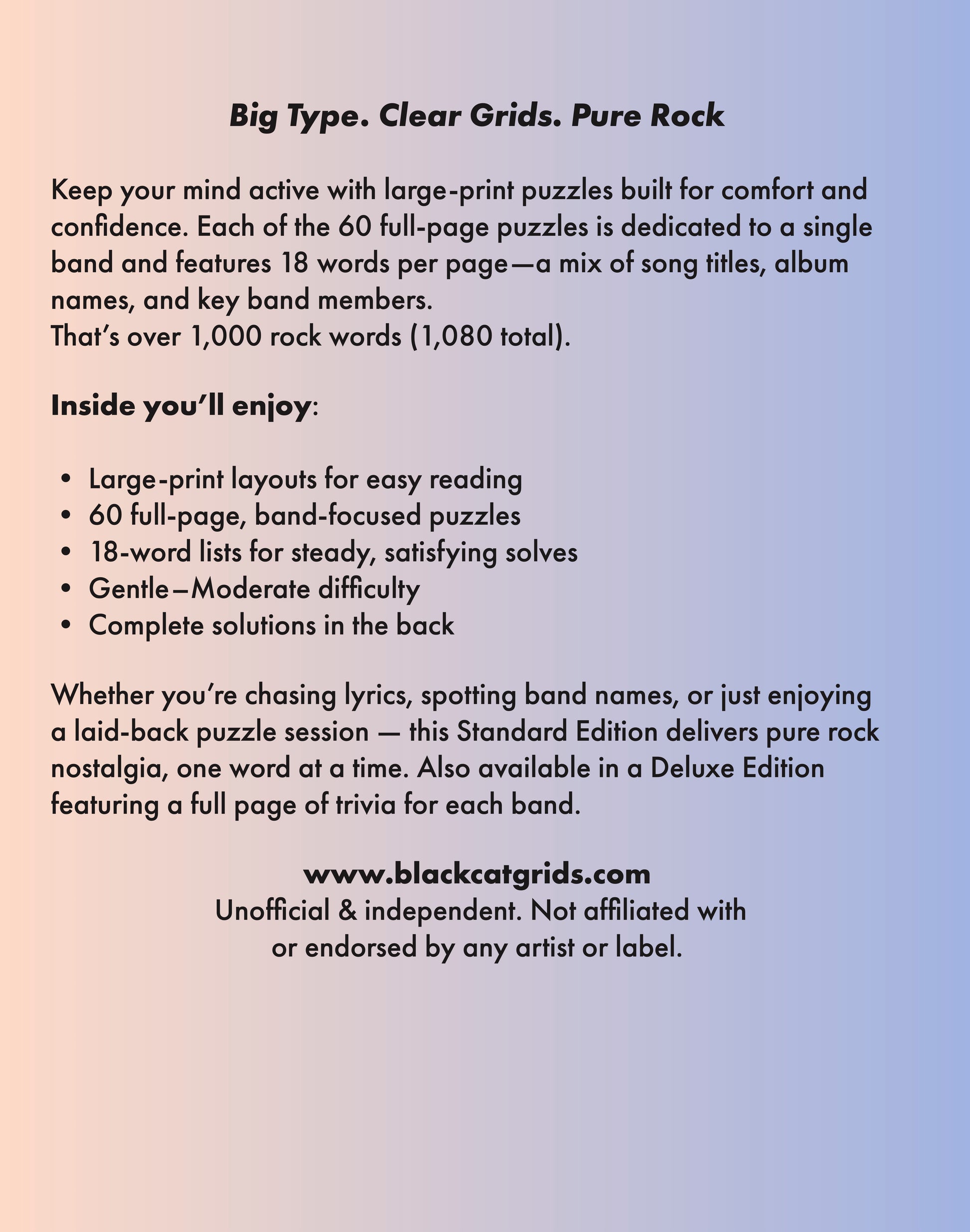Love rock music? This book brings your favourite bands and songs into 60 fun word search puzzles. Each puzzle features 18 words to find, covering classic rock hits, legendary bands, and unforgettable tracks.