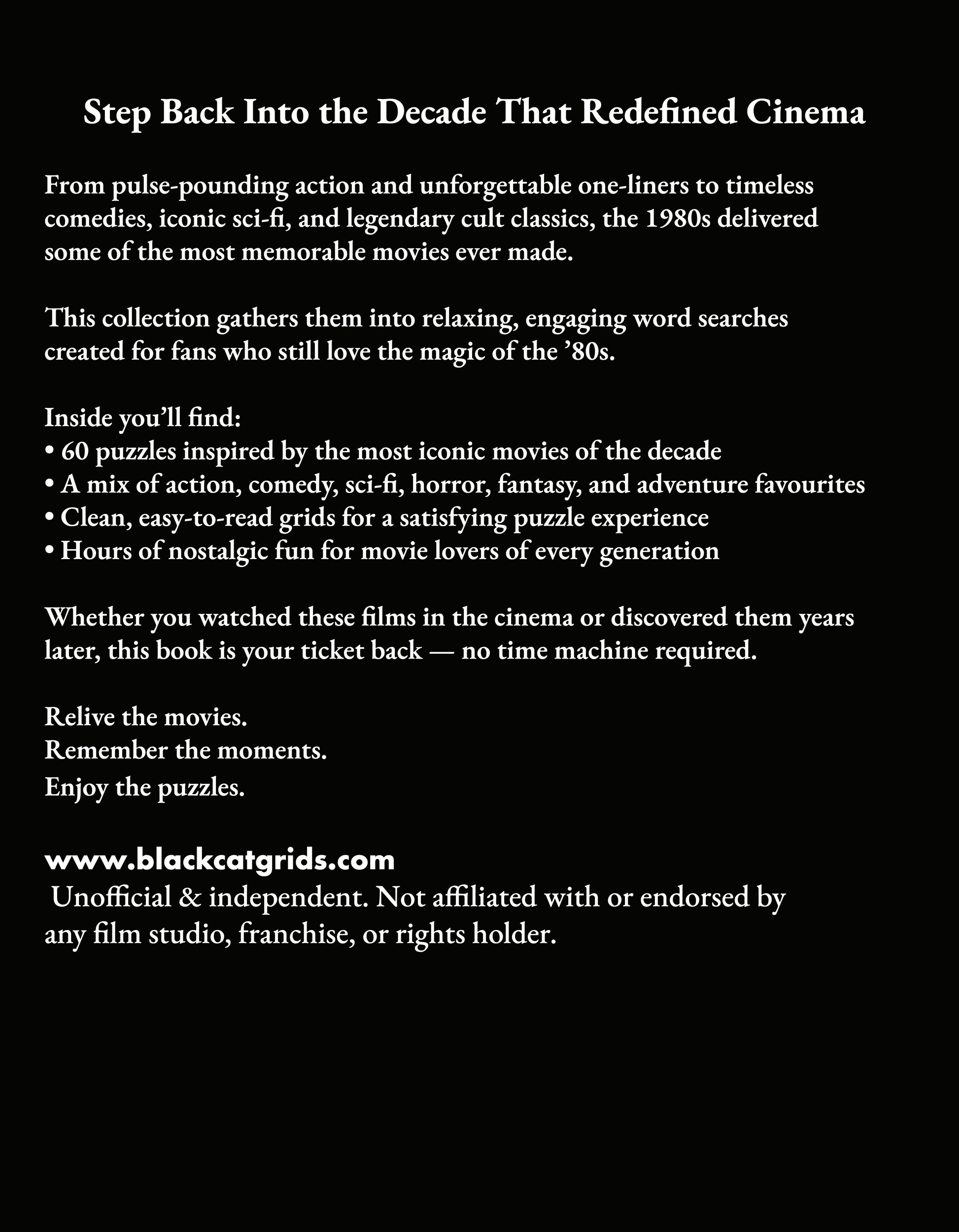 The Ultimate 1980s Movies Word Search brings together 60 puzzles inspired by the most memorable films of the era — from blockbusters and childhood favourites to hidden gems and cult icons. Each puzzle is designed to be relaxing, engaging, and filled with the retro 80s energy movie lovers still can’t get enough of.